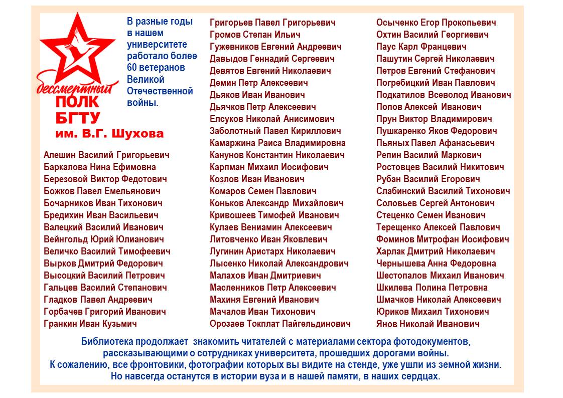 Научно-технической библиотекой на основе публикаций в вузовской газете и документов музея университета, военно-исторических сайтов «Подвиг народа», «Память народа» подготовлена презентация «Бессметный полк БГТУ им. В.Г. Шухова», которая предлагается вашему вниманию.
