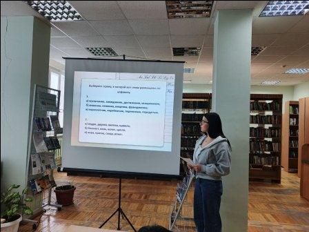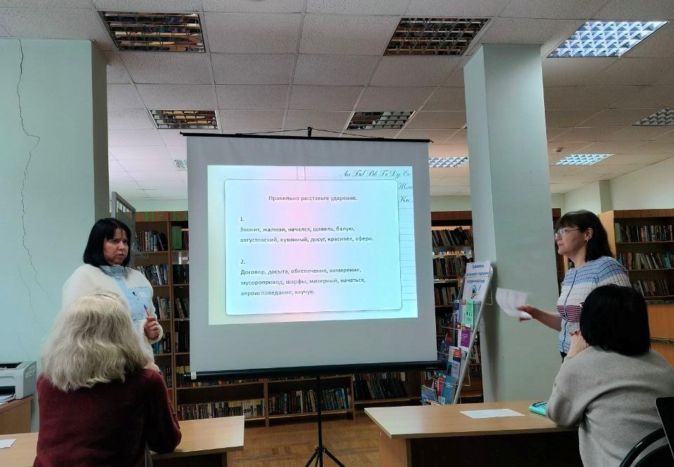 Сегодня, в рамках программы профессионального развития, сотрудники библиотеки окунулись в многообразный и яркий мир родного языка, выполняя различные задания: расставляли ударения в словах, находили пунктуационные ошибки в предложениях и словосочетаниях, вспоминали, из каких известных произведений взяты выражения, узнавали поэтов по первым строчкам их стихотворений и многое другое.